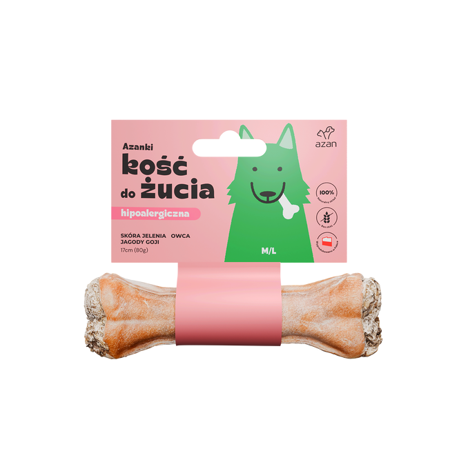 Azanki Kość do żucia M/L ze skóry jelenia z owcą i jagodami goji to wyśmienity przysmak dla dorosłych psów średnich i dużych ras, zaspokajający ich naturalną potrzebę gryzienia i żucia. Kości nie zawierają ostrych i kruchych elementów, stanowiąc bezpieczniejszą alternatywę dla rozmaitych gryzaków.
